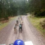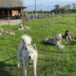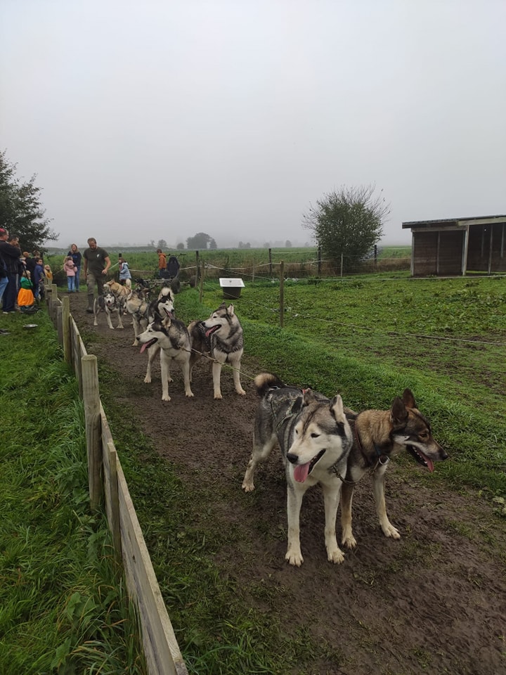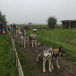 Visite de l’enclos des chiens, caresses, câlins, brossages, explications de leur mode de vie, préparation du matériel, suivi d’une balade en cani marche et d’un petit baptême en kart tracté par 14 huskys autour de notre terrain.